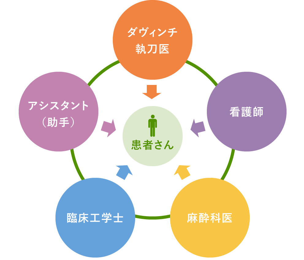 ロボット手術では、執刀医が実際の術野から離れて操作するため緊急時の対応などの懸念がありますが、緊急時に早急にロボット手術チームとして対応できるよう、日頃からトレーニングを行うなどの対策を行っています。