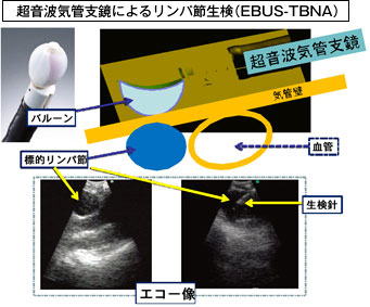 当科では開設以来、最新の診断法である超音波気管支鏡ガイド下針細胞診(EBUS-TBNA) を行ってきました。これは局所麻酔下に超音波を用いて縦隔リンパ節の組織を採取するものです。我々はEBUS普及のために学会などでハンズオンセミナーでの指導を行うと共に、JMTO(LC07-02)多施設臨床研究(「超音波気管支鏡下細胞診による肺がん患者の縦隔リンパ節転移の診断に関する妥当性試験」UMIN試験ID:UMIN000001280)の主幹施設としてエビデンスの確立に努めています。
