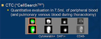 最近になって、がん細胞が比較的早期から血液の中に流れ込むことがわかりました。つまり、一見早期のがんでも実は既に体中に広がっていることがあるのです。これを循環血液中腫瘍細胞(CTC)と言います。実際、手術後に悪性胸膜中皮腫、肺がんなどの胸部悪性腫瘍が再発・転移をきたす一因として、循環血液中の腫瘍細胞CTCの存在が指摘されています。したがって、この腫瘍細胞数CTCを測定すると治療効果の判定や再発・転移の危険度を予測できると考えます。つまり、 CTCはがんの早期診断・治療方針の決定・治療効果の判定に非常に重要な情報なのです。この技術は、日本はもとより世界中でもまだまだごく一部の施設でしか導入されていませんが、米国FDAは乳がん治療において既にCTCを認可しており、今後急速に普及してゆくと考えられています。