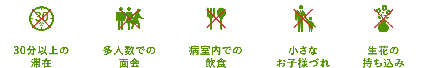 - 多人数での面会や、病室内での飲食、小さなお子様づれの面会はご遠慮ください。